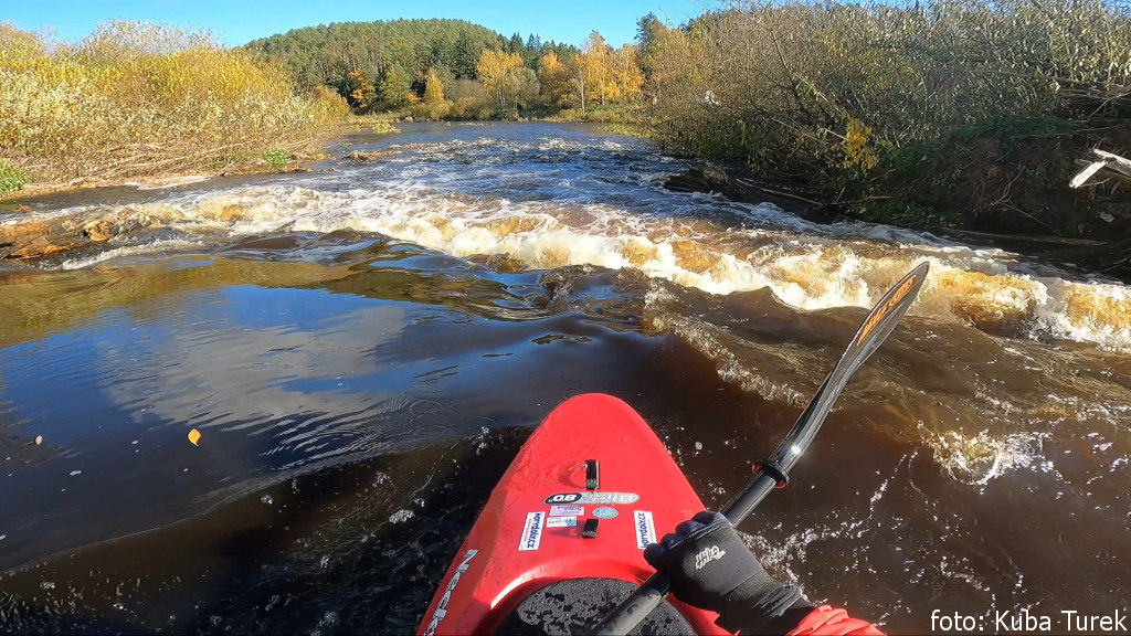 jez přenést vpravo vysoký (m) 0,9 !! jez Páteček, přepad z Volšovky vpravo, most pěší nebo lávka Červené Dvorce vlevo, 0,5 km |