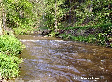 r.km ,0 Peřejky na Tiché před ústím, v pozadí zprava přitéká Mže