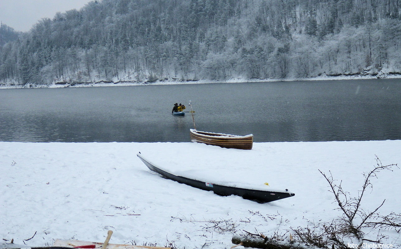 Odpoledne pak najednou odkudsi přišel, nebo spadl a byl tady. Nápad… Nasněžilo, máme svah zakončený nezamrzlou vodní plochou, máme krom nóbl lodiček i jednu obyčejnou plastovku, pojďme s tím něco udělat… Pravda, že nikdo z nás neměl se snowcanoeingem pořádné zkušenosti, ale zato nadšení nechybělo. Vytyčili jsem trať a vyrazil první jezdec. Ale ono to nejelo. Tedy napoprvé. Nicméně s každým dalším pokusem byla trať rychlejší a gejzíry při dojezdu do vody mohutnější. Nejvíc bodů nakonec nasbíral kamarád Luboš, protože piruetku ve vzduchu i s lodí, to jen tak někdo nezvládá.