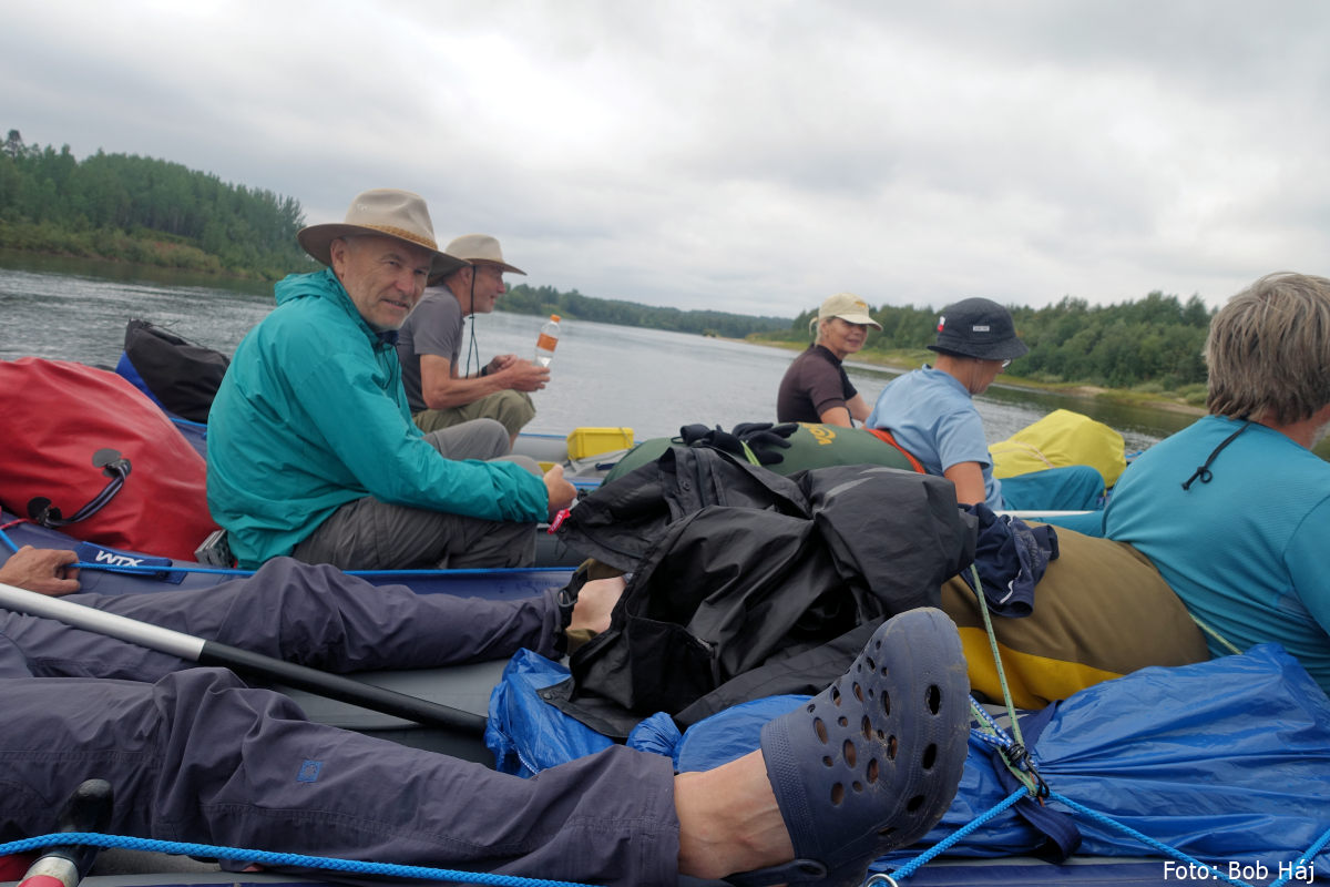 V řece je dost nízký stav vody a v kamenitých mělkých peřejkách každou chvíli někdo zůstane viset. My si k tomu přidáme ještě silnější zážitek, když při té příležitosti začne do lodi proudem téct voda. Tak musím rychle ven, nadzvednout loď z balvanu, postrčit ji do proudu, … a protože jsem nestačil na těch šutrech naskočit, tak se držím za záď kánoe, háček ječí, a já plavu za lodí v proudu. Balvany, které přejíždíme, mě pěkně promasírují, ale v pohodě v tišině pod peřejí odkoníčkuju naši nepotopitelnou ponorku ke břehu, kde už čekají kamarádi. Houbou vysušíme loď a jede se dál. Je léto, máme krásné počasí, koupel v peřeji dopadla bez šrámu, takže pohoda. Přes zážitky z peřejek a krásného okolí si ani neuvědomujeme, jak daleko už jedeme, ale únava se začne hlásit. Tak hledáme místo k utáboření, jenže pořád to nejde. Až po úmorném pádlování předlouhou tišinou přijíždíme k místu, kde řeka na skalním zlomu uhýbá stranou. Před námi se vynořuje „pláž“, jak připravená pro naše stany, táborák a kouzelný západ slunce. Druhý den projíždíme kolem osady Kuttura, kde po mostě nejezdí auta, ale přecházejí sobi.