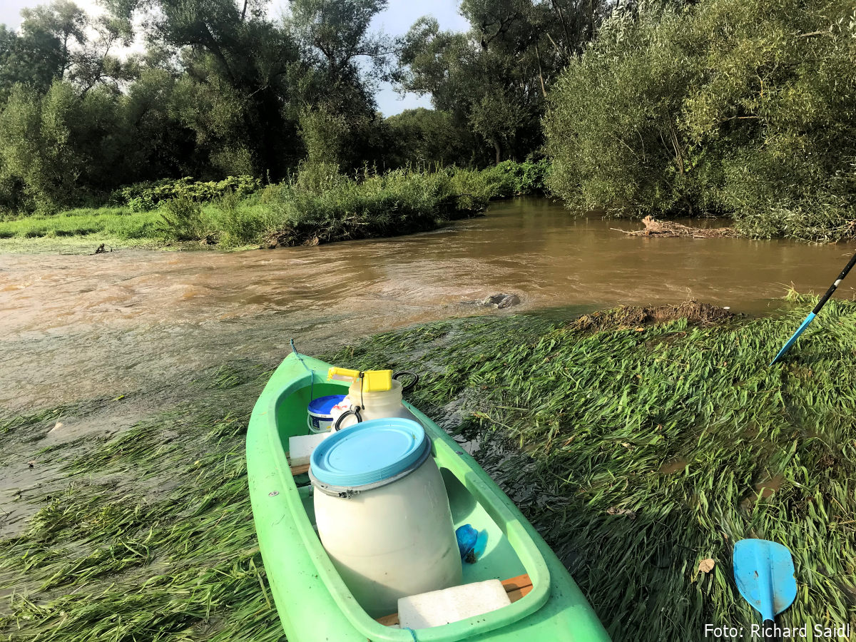 Chci jet po louce, kdy se mi něco takového povede, ale manželka zavelí zpět na řeku. Po dalších 30 m vytahujeme znovu, tentokrát na druhém břehu. Také zde teče proud vody, ale podstatně menší. Po 50 m se vracíme zpět do řeky, abychom ujeli 30 m a zase vytahovali.