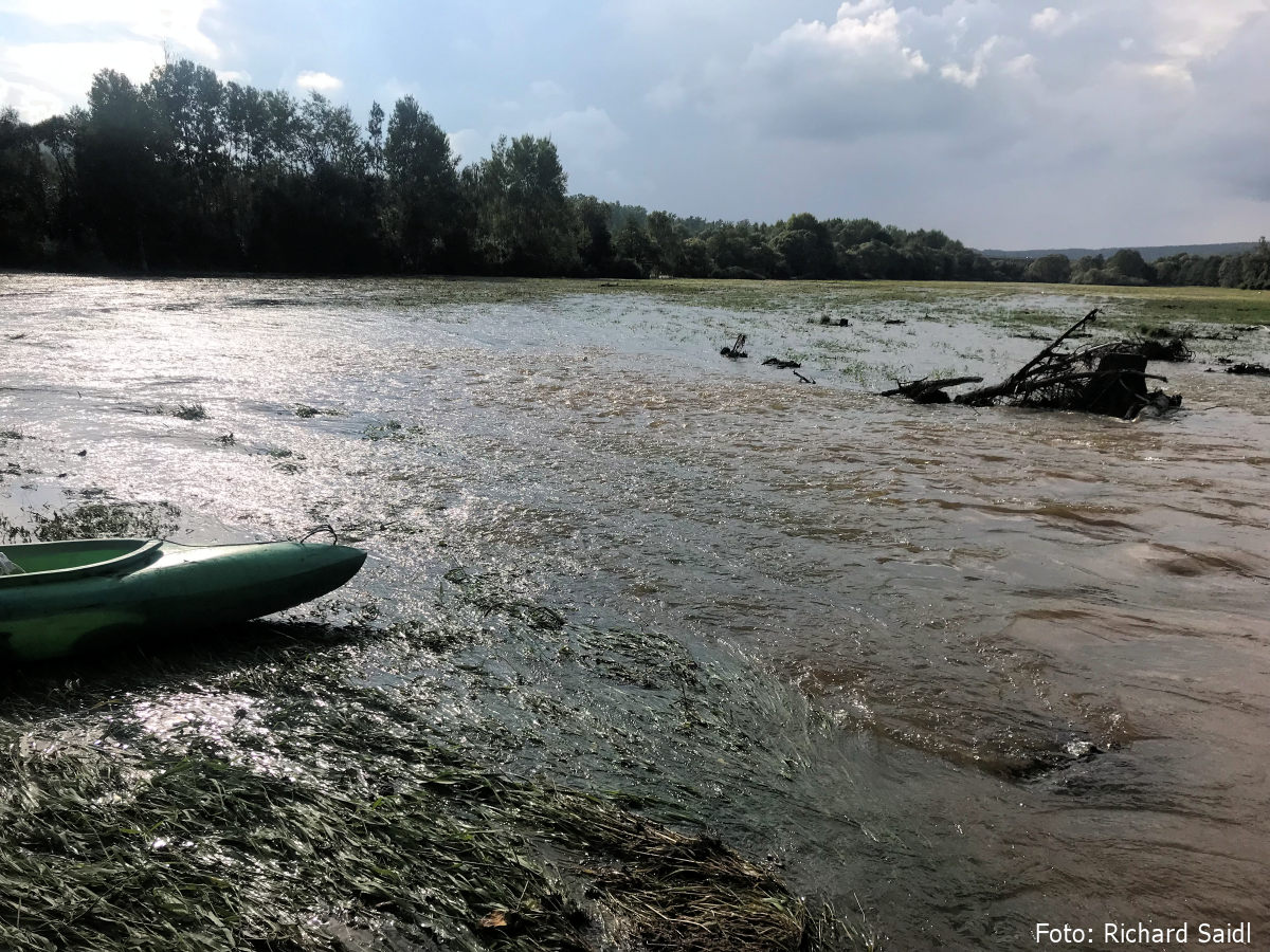 Tam vytahuji, táhnu do další laguny na louce, a pak dokonce na louce i oba pádlujeme. Voda mizí v dalším křoví, ale blízko je hlavní koryto a vypadá lépe. Na začátek vzdutí už pouze jedno přetahování.