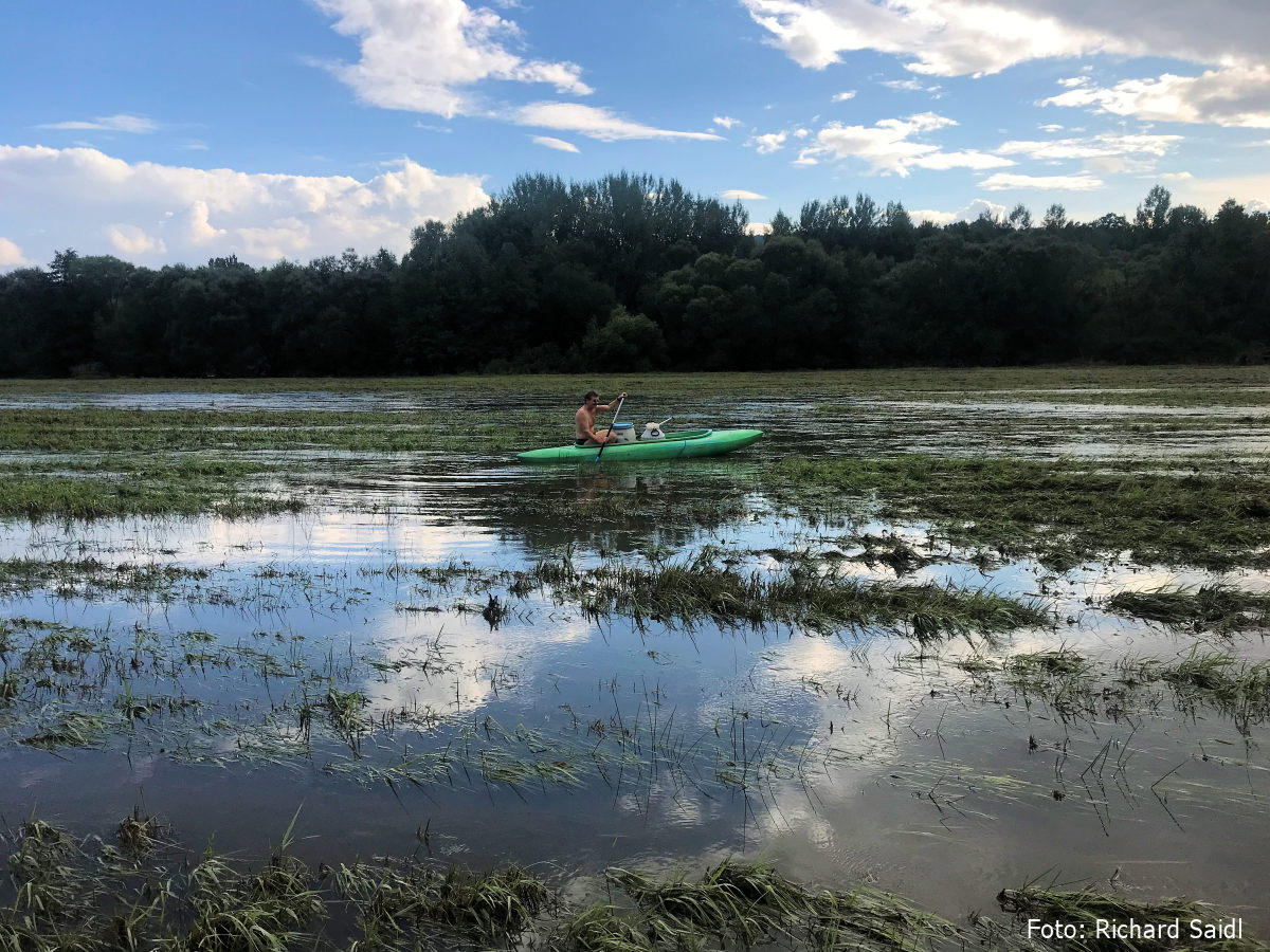 Tam vytahuji, táhnu do další laguny na louce, a pak dokonce na louce i oba pádlujeme. Voda mizí v dalším křoví, ale blízko je hlavní koryto a vypadá lépe. Na začátek vzdutí už pouze jedno přetahování.