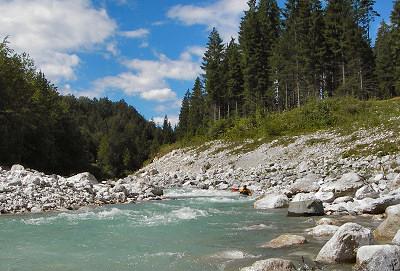 Po téměř celém přejezdu Německa se ráno probouzíme v kempu Grainau u řeky Loisach nedaleko Garmische. Jdu se podívat na řeku, která nám hučí za stanem. „No, tak to teda nevím, jak tohle pojedeme,“ napadá mě při pohledu na široké koryto a uprostřed tekoucí řeku. Kameny vystupují nad hladinu, ale jet se to zde dá. Jenže, co bude výše? Tam má být WW IV soutěska, takže to snad bude uzší.