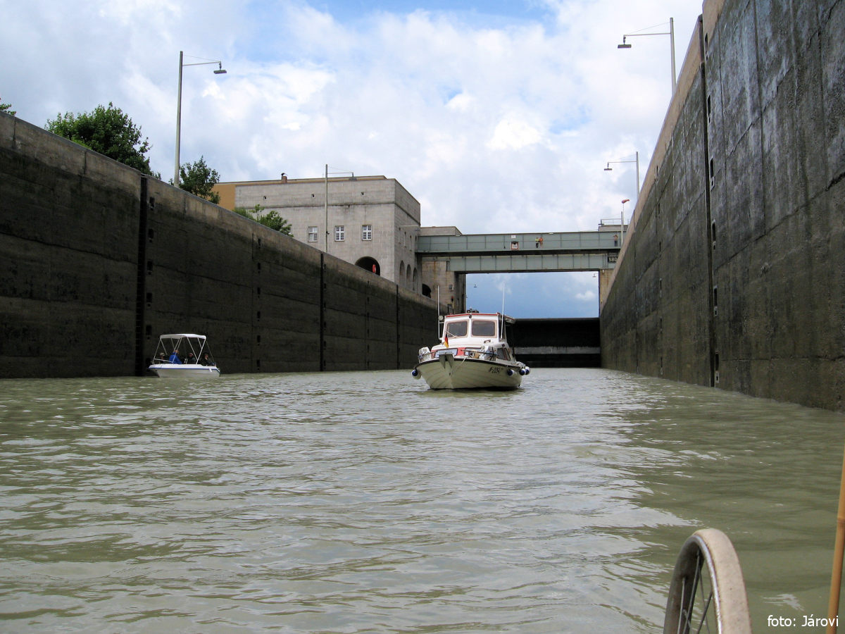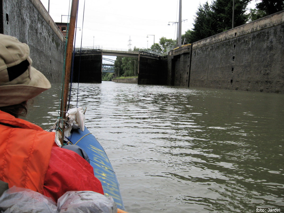 Další den je pošmourno, ale zatím neprší. Přijíždíme k hrázi a nevěřícně dojíždíme podle šipek tentokrát až k ní. Kde můžou tady mít schovaná kolajda? Nikde nic, jen po pravé ruce nám visí nějaký zvoneček, Zkus zazvonit, třeba nám je hrázný vydá, říká Jarek. Kdepak, před námi se začala sklápět stěna a objevila se dlouhatanánská prudká šlajsna. Z té hloubky se nám zatočila hlava a rychle couváme. Stěna se zas začala zavírat. Tak to teda ne, rychle tam zajeď, velí kormidelník. Museli jsme zazvonit ještě jednou, a pak už fičíme stojedenáctimetrovým sjezdem dolů. Dole vítězně zvedáme ruce nad hlavu a kormidelník říká – já měl jen strach, abychom tu neutrhli kormidlo. Úplně mi zatrnulo – na Dunaji bez kormidla, to by byl průšvih, a ani bychom si bez něj nezaplachtili.