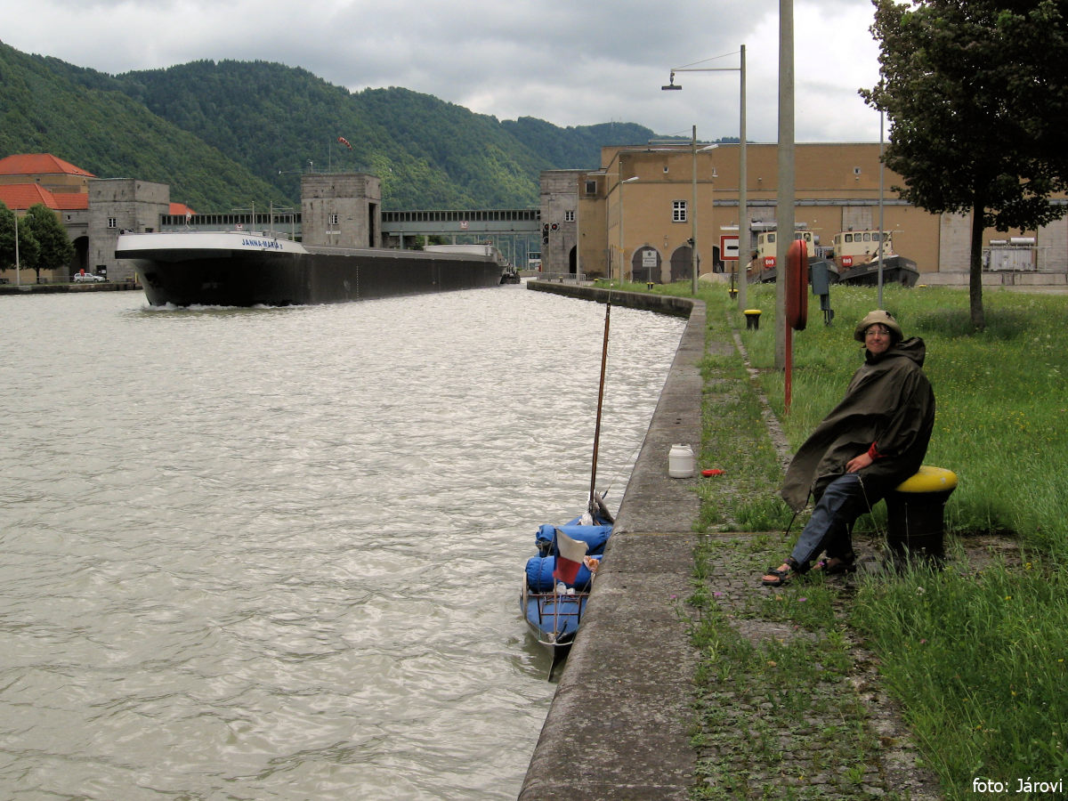 V dalším pošmourném mrholivém dni dojíždíme k hrázi přehrady Kachlet. Je tam sice možnost opět si půjčit na převoz kolajda, ale taky telefon, kterým se můžeme ohlásit hráznému a požádat o spuštění komorou. Jarek mě hecuje, abych to vyzkoušela. Sbírám v paměti anglická slovíčka (německy jsem se neučila), ale plavební komoru znám jen německy. Tak takovou splácanou větou ohlašuji jméno lodi, a že chceme do komory. Kupodivu se ozvalo:„Ja“. Z komory právě vyjíždí parník, pak se rozsvítila na semaforku zelená a najeli jsme do ní my. A hned se vezeme dolů, sami. To bylo překvápko! Jarek hned počítá, kolik vody taková komora obsahuje a o kolik výkonu přišla naším spuštěním elektrárna. A kolik by to asi bylo peněz.