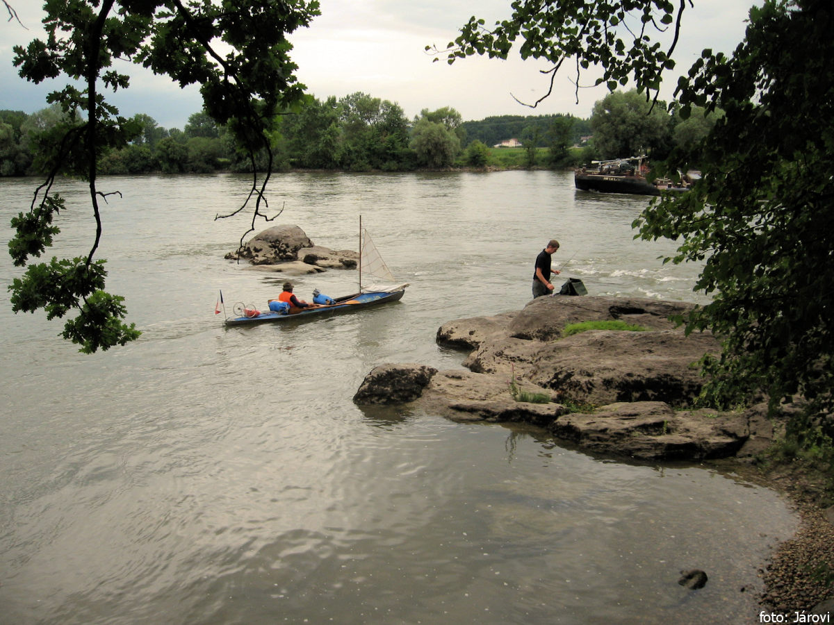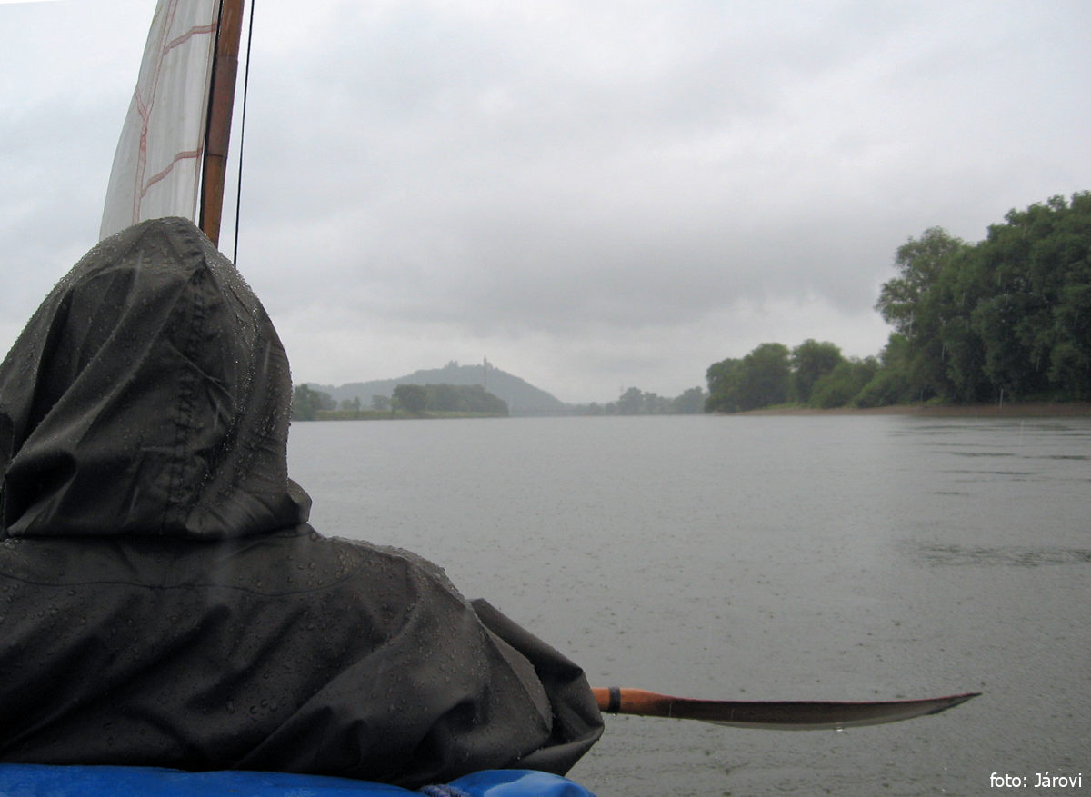 Šlajsnou jsme se dostali do delšího ramene, které se přibližuje blíž k městu Straubing a tam začalo pršet. Schovali jsme se pod mostem, já vytáhla svačinu, Jarek si raději zašel na něco do města, ale ani po čase déšť neustal. Rozhodli jsme se pokračovat, dokud nepromoknem, a v pláštěnkách jedeme dál. Byl to trochu tanec s čertem – pořádně lije, fouká vítr, jedeme na plachty, nárazy větru nám naklání loď, že se občas dotkneme plachtou hladiny. Ale pěkně to ubíhá. Nicméně po hodině či dvou toho máme dost a přistáli jsme na sympatické písečné mělčině. Šlápli jsme do vody a měli jsme pocit, že se opaříme, tak jsme měli zmrzlé nohy. Nevím, zda by bylo lepší nechat si je Dunajem rozehřát nebo se zmrzlýma vlézt do spacáku a zahřát se sami. Rozhodli jsme se pro to druhé, rychle postavili stan a zalehli.