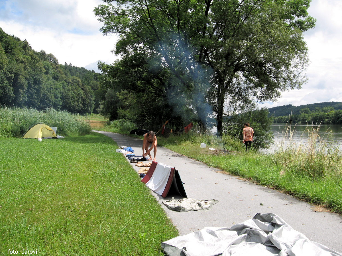 Za poměrně pěkného dne pak pokračujeme až k další přehradě Straubing. Občas jsme si dali pohov na břehu na oblázkových plážích, občas bylo dost větru na to, abychom zvedli plachty. Přenášku Straubingu jsme si nechali na další den. Spíme na trávníku vedle cyklostezky.
