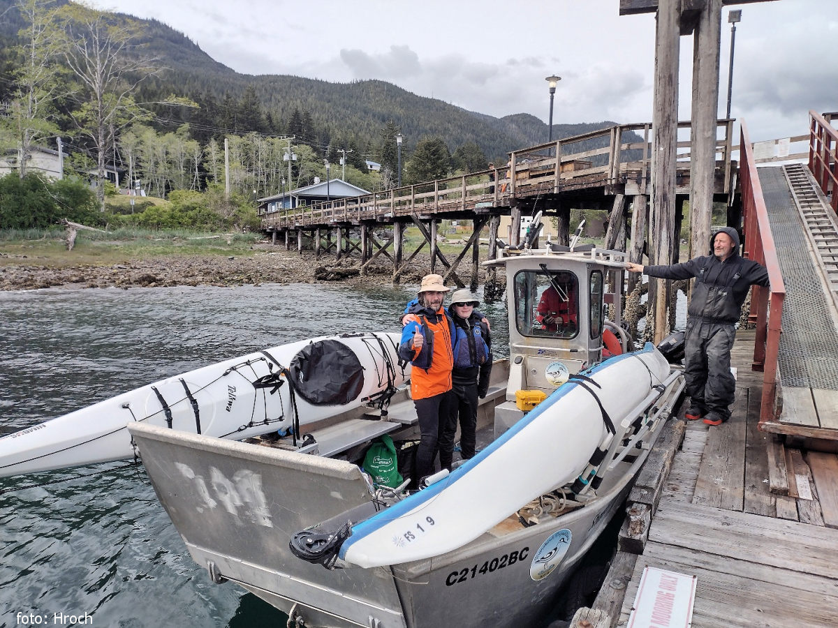 Horší to bylo s dopravou do námi vybraného startu u mysu Garden Point a z plánovaného cíle, osady Yuquot. Pádlovat od auta 28 km relativně monotónními fjordy na začátku a potom k autu dalšími 38 km na konci výpravy se nám nechtělo. Běžně se k dopravě v oblasti používá historická nákladní loď Ukchuck III. Ta za mírný poplatek při svých pravidelných plavbách sveze kajakáře i s kajaky a ještě je pěkně lodním jeřábem položí na hladinu na jednom z určených míst. Bohužel v našem termínu jel zrovna Ukchuck III do doku na opravu. Místní hydroplán Nootka Airu neumí vozit kajaky na plovácích a dovnitř se nevejdou. Využili jsme tedy služby vodní taxislužby Shorebird Expeditions. Taxi operuje z přístavu Tahsis, do kterého lze relativně snadno dojet autem. Jen je pak třeba auto pořádně umýt, aby se zbavilo nánosů prachu nachytaným na několika desítkách kilometrů šotolinové cesty. Vodní taxíky jsou ‚invazního typu‘, v podstatě pramice s výklopnou přídí a držáky kajaků na bocích. Jízda takovým člunem je zážitek sama o sobě, celé to po vodě skáče jak placatý kámen a kajaky navzdory sofistikovanému upevnění dostávají co proto. Cestující se občas sprchují ve vodní tříšti, ještě že jsme si před plavbou prozřetelně vlezli do gumy.
