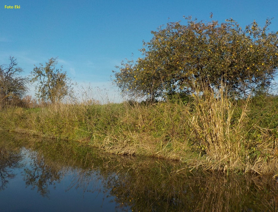 Koryto říčky lemují vedle vrbiček stále i ořešáky, třešně, jabloně a hrušně. U jedné jabloně přistávám a dávám si zdravou svačinku.