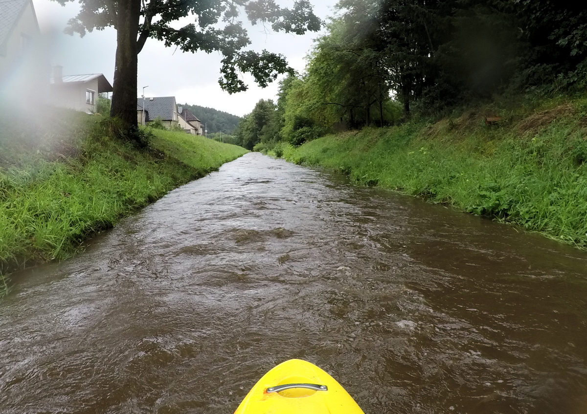 Začátek srpna je deštivý, všude to teče. Sice jsem si dal závazek, že v létě nebudu žádné úzké potoky splouvat, protože se obvykle jedná o splachovadlo, kde nejsou skoro žádné vracáky a pokud jsou, tak se do nich nedá dostat, jelikož jsou zarostlé. U Dřevíče dělám výjimku, jelikož to není žádná divočárna. Musím jednat rychle, voda začíná kulminovat a bude rychle padat dolů.