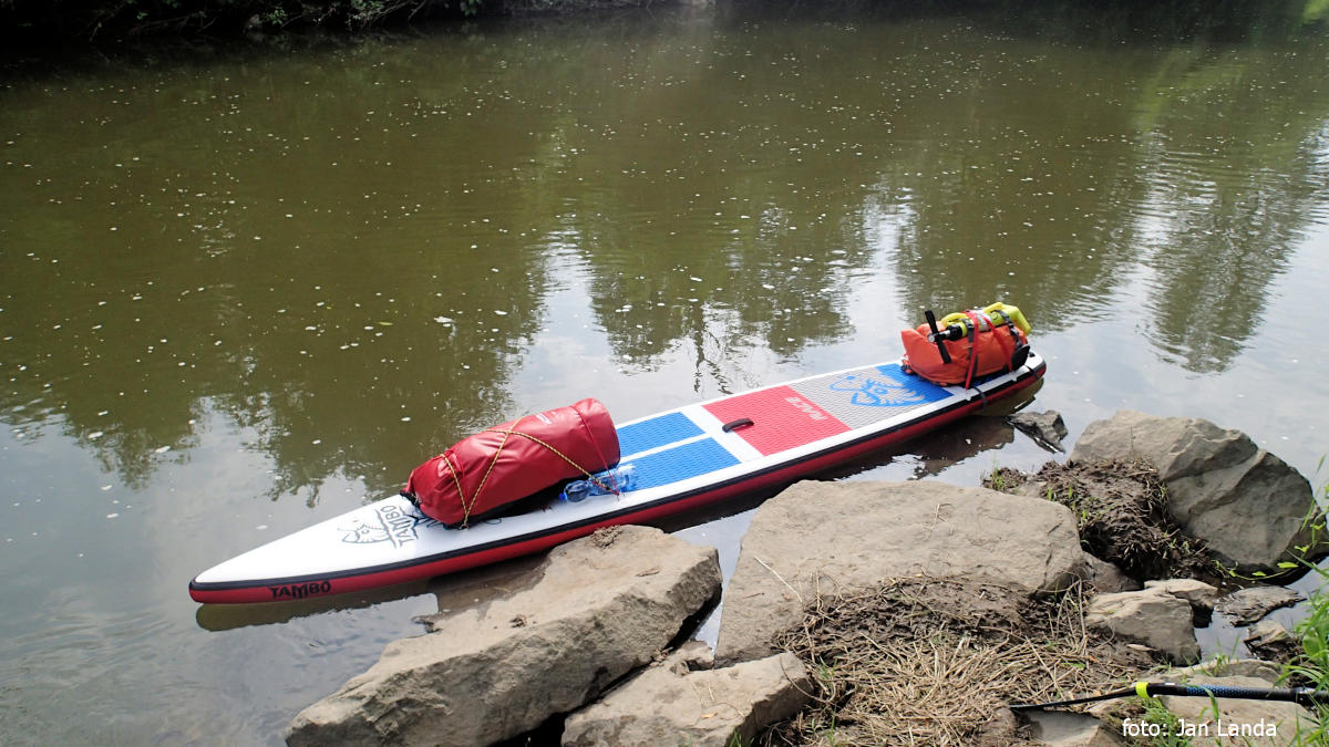 Ráno ještě za tmy balím zapůjčený padlleboard a výbavu na 14 dní a nasedám na vlak, který mne po 9. hodině vysazuje na nádraží Ostrava – Svinov. Odtud je to k řece jenom kilometr a půl, ale s plnou polní a s paddleboardem sbaleným v loďáku mi dá cesta k místu startu pořádně zabrat. Než se dovleču k vodě, nafouknu prkno a naložím cajky, je skoro oběd.