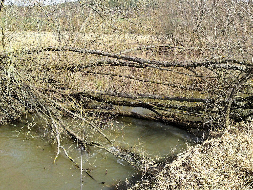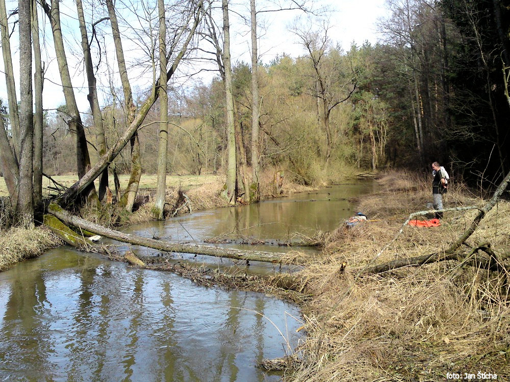 Pod Šebířovem si nás všimli lesníci a ozvalo se první vodácké ahóóój. Češi jsou národem vodáků, ale na některých tocích působí jejich přítomnost značně exoticky a budí spíše překvapení a údiv, ne-li přímo pozdvižení či nepochopení. Tentokrát to byl překvapený údiv. Za uříznutým stromem, který teď krátce sloužil zřejmě jako lávka, následovala vrbičkárna a často popadané kmeny, které přeťaly řečiště na jednotlivé úseky. Pod některými překážkami jsme se prodírali jen z trucu, abychom si nezapočítali další přenášení nebo přetahování. Někdy to málem odnesla záda, jindy nám dokonale nafackovaly větvičky zprava i zleva. Ze všech nejvýživnější byla šípková větev, která se se mnou družila, jako bychom byli nejlepší kamarádi. Vzhledem k proudící vodě a prudkým meandrům jsem si jeden ze šípkových trnů mohl z hlavy vytrhnout až po několika říčních metrech. V podobném duchu se místy velmi hluboká říčka táhla džunglí popadaných stromů, naplaveného dřeva a vrbiček až ke vzdutí mohutného rybníka.
