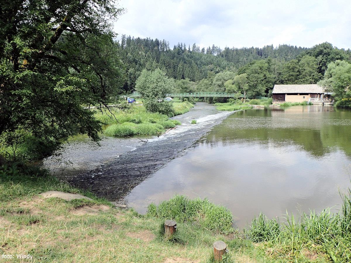Jez Podělusy je zcela opravený a průjezdný sportovní šlajsnou u pravého břehu. Před šlajsnou jsou ka ...