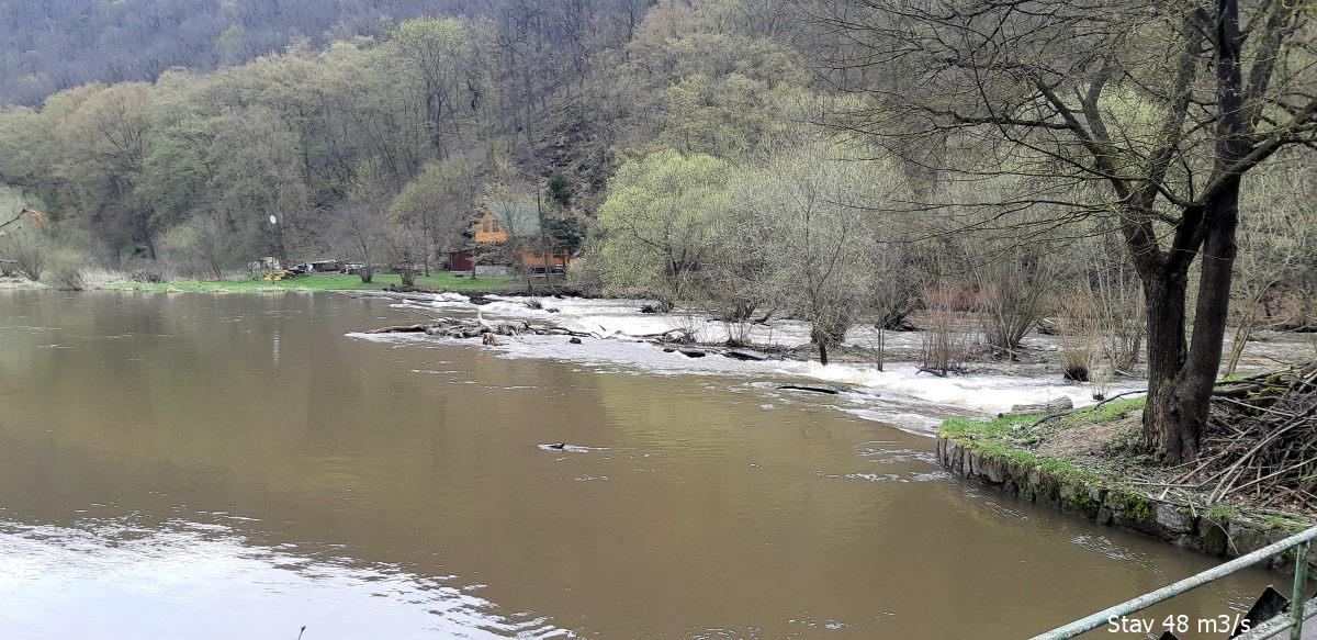 cca 74,0 ř.km v Březině za siln. mostem po vracení nahonu spadly strom přes celou řeku a